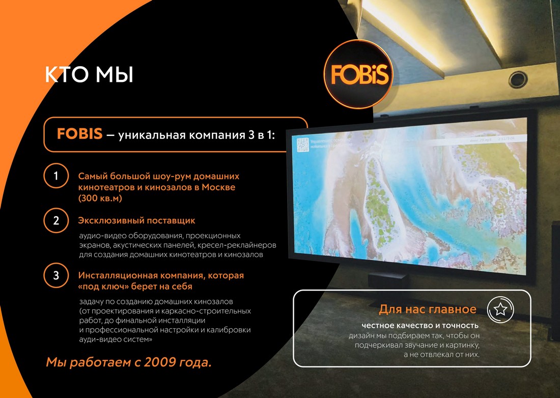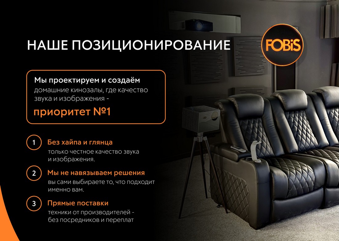 Мы демонстрируем, поставляем, устанавливаем и настраиваем исключительно то, что непосредственно влияет на изображение и звук. На ваши эмоции при погружении в мир кино.