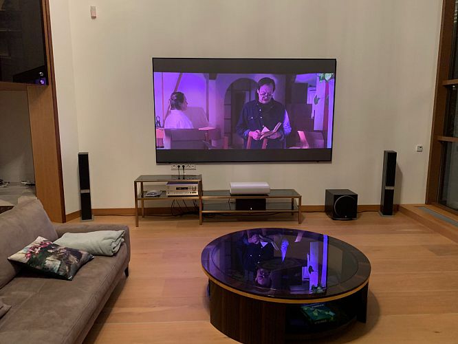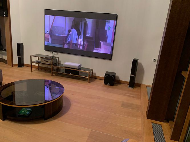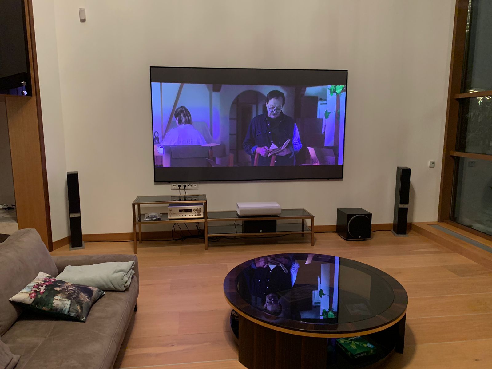 Заказчик самостоятельно изучил весь вопрос и сам выбрал решение с ультракороткофокусным проектором Samsung LSP9T и специальным ALR экраном.