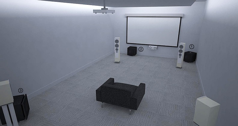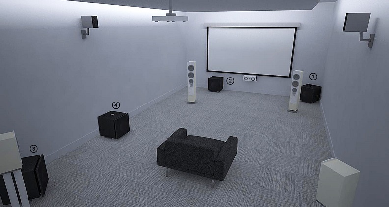 Главный (первый) сабвуфер должен располагаться в переднем углу. Его можно настроить на высокий уровень баса.