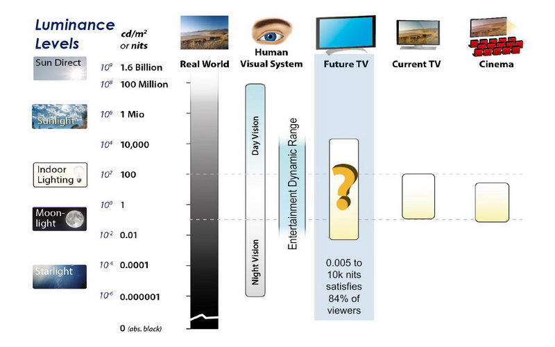 Реальный мир обладает чрезвычайно широким динамическим диапазоном. То же самое демонстрирует и зрительная система человека; мгновенный динамический диапазон человеческого зрения обозначен на этом рисунке как "Entertainment Dynamic Range". "Телевидение будущего" представляет собой результаты исследования потребительских предпочтений Dolby, в то время как "Текущее телевидение" соответствует SDR. (Источник: Dolby)