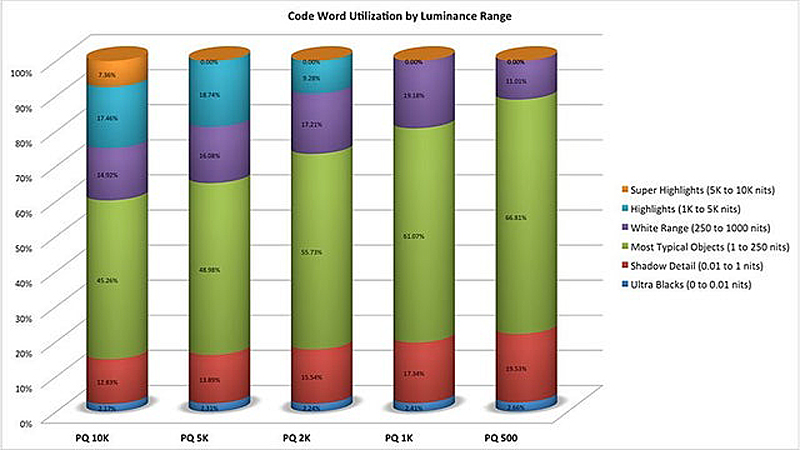 На этой диаграмме показано распределение кодовых значений для различных уровней пиковой яркости. Во всех случаях большинство значений используются для обычных объектов до 250 нит.