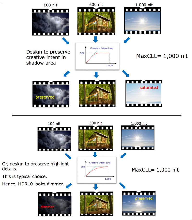В этих примерах со статическими метаданными HDR10 MaxCLL составляет 1000 нит, а пиковая яркость дисплея - 500 нит. В верхнем примере кривая Tone Mapping предназначена для максимально возможного сохранения яркости исходного сигнала, что сохраняет детали теней в сценах с низким освещением, но приводит к тому, что сцены с ярким освещением выглядят пересвеченными. В нижней части кривая тонального отображения обрывается гораздо раньше, сохраняя детали в светлых пиках за счет более низких уровней, из-за чего вся картинка выглядит тусклее