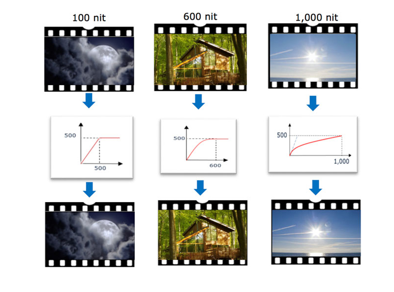 При использовании динамических метаданных дисплей настраивает кривую отображения тонов (Tone mapping) для соответствия различным типам сцен с разными APL. В результате все сцены выглядят наилучшим образом, и не приходится жертвовать низким APL ради сцен с высоким APL или наоборот.