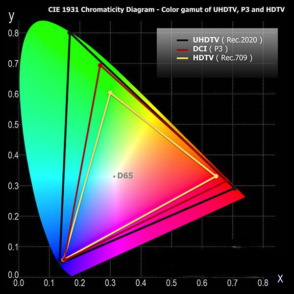 В дополнение к более глубокому черному цвету и более ярким бликам дополнительным преимуществом HDR является более широкий диапазон цветов - обычно называемый широкой цветовой гаммой или WCG — по сравнению с SDR. Это легко могло бы стать предметом отдельной статьи; но на данный момент достаточно сказать, что цветовая гамма SDR известна как BT.709, а цветовая гамма HDR — технически BT.2020. Однако очень немногие дисплеи могут отображать весь диапазон BT.2020, поэтому в HDR контенте обычно используется промежуточная гамма, называемая DCI-P3.
