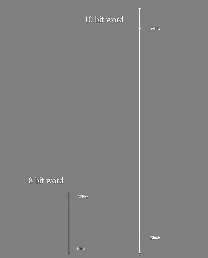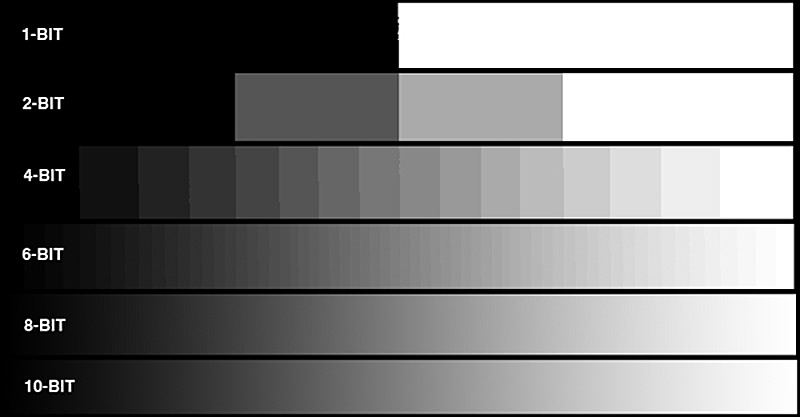Во всех цифровых видео яркость представлена цифровым числом, состоящим из нескольких битов. Чем больше бит, тем меньше шаг между последовательными значениями яркости. С помощью всего нескольких бит люди могут видеть эти шаги по мере увеличения яркости. Если число битов увеличивается за определенный предел, то мы уже не можем различать резкого перехода по яркостным уровням и мы видим плавную градацию яркости.