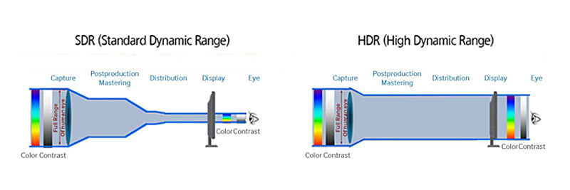 В стандарте SDR процесс мастеринга требует значительного сокращения динамического диапазона захваченного контента; в HDR сохраняется гораздо больший динамический диапазон вплоть до конечного продукта (ТВ или проектор).