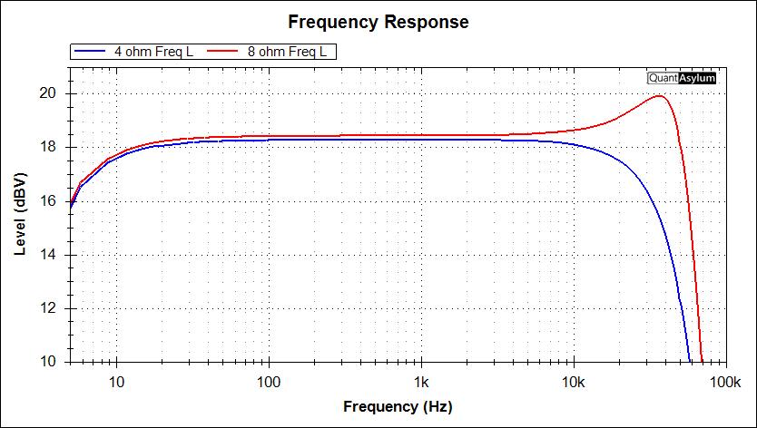 При 8 Ом частотная характеристика увеличивается примерно на 10 кГц, достигая пика на 35 кГц на +1,6 дБ. На частоте 20 кГц подъем составляет примерно 0.5 дБ или около того. Просто примечание: фильтр верхних частот, замеченный в моем измерении, встроен в мое измерительное устройство, он составляет -1 дБ при частоте 7-8 Гц, что говорит о том, что этот усилитель, по крайней мере, так же хорош.