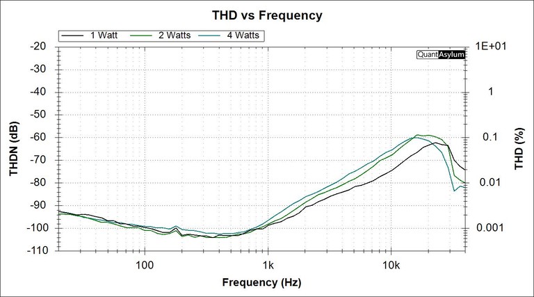 В моих измерениях мы видим, что искажение составляет около 0,001% между 100 Гц и 1 кГц, после чего оно увеличивается. На частоте 5 кГц мы видим, что искажения выросли до 0,005% при 1 Вт, и 0,05% при 4 Вт соответственно.